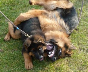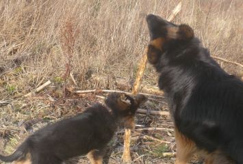 traf er auf dem Übungsplatz Piet, ein Nachkomme von Dorcas und Buddy . Piet ist ein sehr lieber Rüde; BJ wollte gleich wissen, wie weit man hier gehen kann |