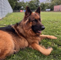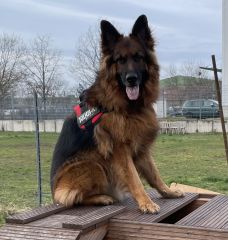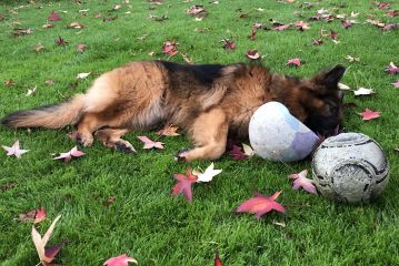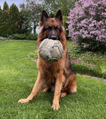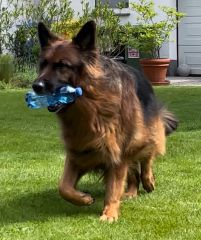 Hachiko mit seinem Spielzeug. Ein stolzer