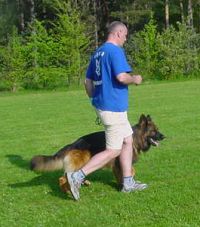 Herrchen läuft, gibt während des Laufens das Kommando zum "Platz"