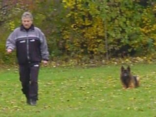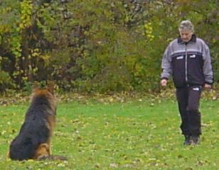 Herrchen läuft, gibt Kommando "Sitz" und läuft weiter,